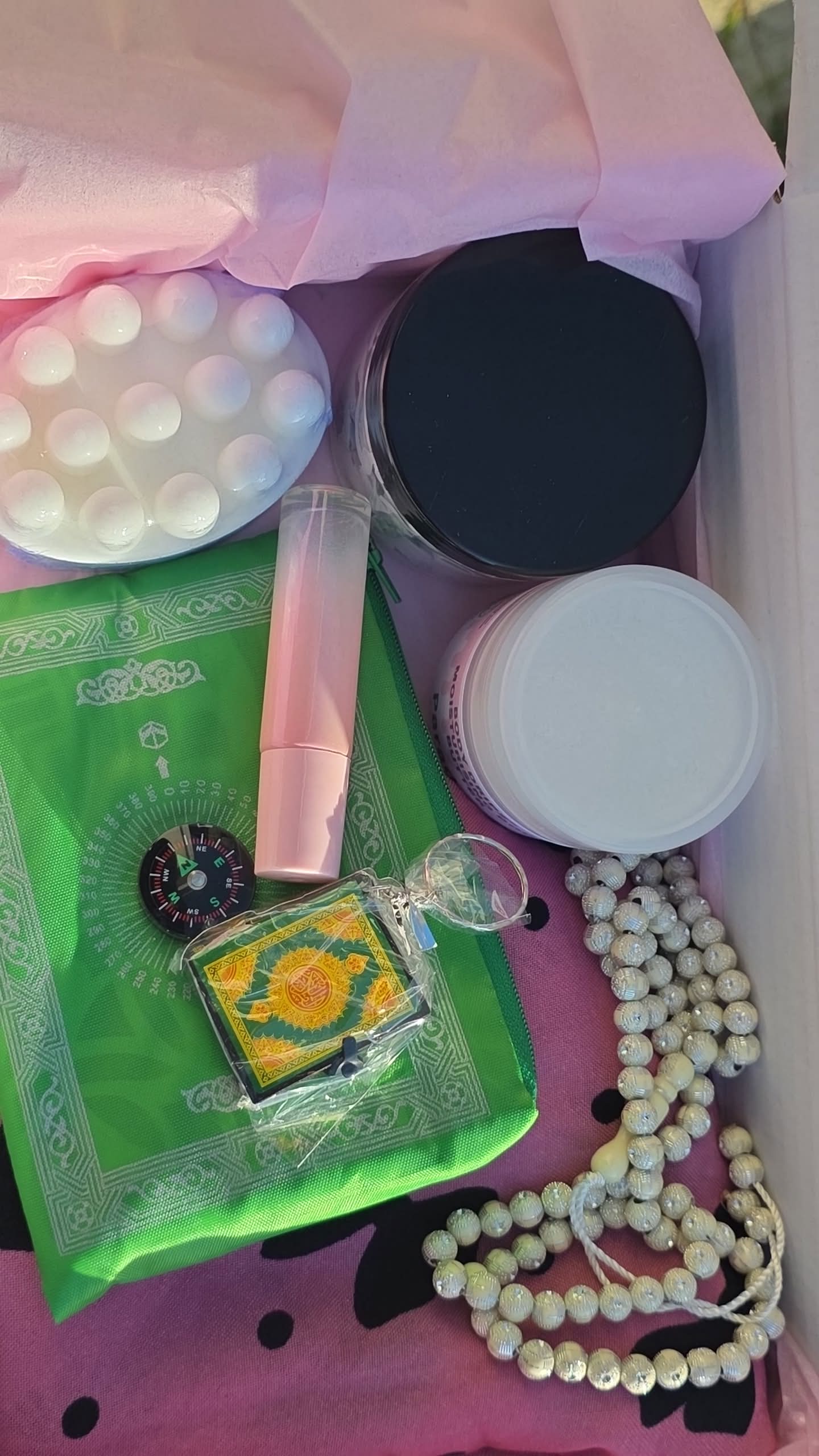 This Eid/Ramadan gift box includes essential items for your spiritual journey, including a compact Quran, a prayer counter, a soft prayer mat, and a traditional prayer hat for men or scarf for women. Stay prepared and focused on your spiritual growth with this thoughtful gift box.