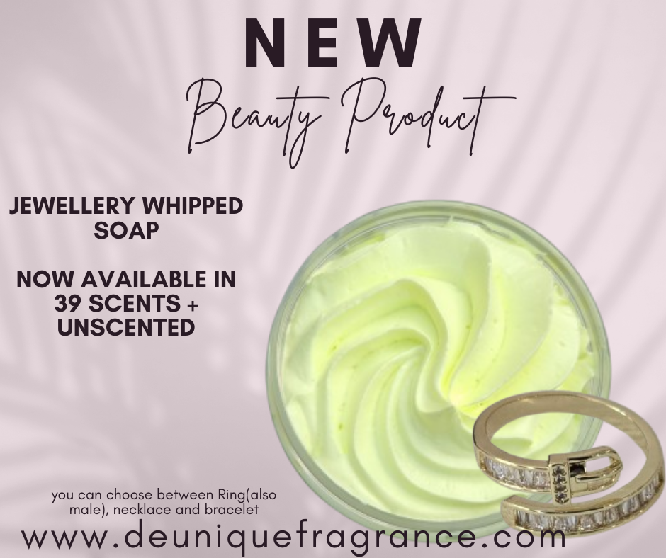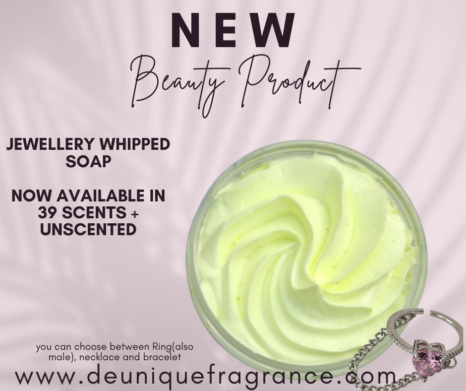 Indulge in luxury with our Jewellery Whipped Soap. Each batch is handcrafted to perfection, leaving your skin feeling soft and nourished. What makes it even more special is the hidden jewellery surprise! With a wide range of options including rings, bracelets, and necklaces, the perfect accessory is waiting for you. Elevate your self-care routine today.